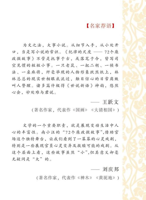 《纪律的尺度——72个廉政微故事》不管是托事于古,或落笔于今,皆写司空见惯的桩桩小事。一只老鼠、一把二胡、一帧书法、一桌麻将,纤毫毕现的人物形象跃然纸上,林林总总的现实世相眼底流过,触目惊心的日常腐败叫人警醒。诸多篇什极得《世说新语》神韵,悠然心会,妙处难与君说。